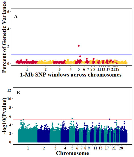 Manhattan plots showing the genome-wide association results for viral load at 6 dpi using Bayes-B and single-SNP analyses. (A) Bayes-B results show the percent of genetic variance explained by 1-Megabase (1-Mb) nonoverlapping windows of SNPs across chromosomes. (B) Single-SNP results show the −log10(p-value) of ordered SNPs across the chromosomes. The blue and red lines indicate genome-wide significance at 1% genetic variance and 20% suggestive adjusted Bonferroni correction, respectively.