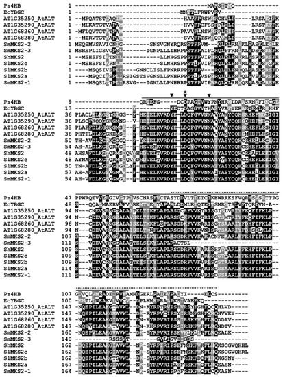 A multiple sequence alignment of the SmMKS2 sequences and a subset of the homologous proteins showed that the eggplant sequences included a conserved aspartate (Asp) required for the catalytic activity of single Hotdog fold thioesterases (Figure 1). The Asp residue was located at position 17 in the 4-hydroxybenzoyl-CoA thioesterase (4HBT) from Pseudomonas sp. strain CBS and previously identified as the catalytic residue required for thioester bond cleavage [26]. In line with this, conversion of the equivalent aspartate to alanine abolished the thioesterase activity of ShMKS2 and ALT1 [6,7]. In addition, the full-length amino acid sequence of SmMKS2-1 and SmMKS2-2 also contained a C-terminal Hotdog-fold superfamily domain, a typical domain of single Hotdog fold acyl-ACP thioesterases found in different plant taxa [6,7]. Based on the amino acid sequence, thioesterases have been divided into 23 different families and the plant MKS2 proteins belong to the thioesterase family 9 (TE9) [27]. Structural characterization of YbgC thioesterases in TE9 [27,28] and the alignment of the plant MKS2 sequences with EcYbgC (Figure 1) identified Tyr78, Asp81 and Asn88 (numbered relative to the sequence of SmMKS2-1) as the most likely candidates for catalytic triad residues of the plant MKS2s. Notably, SmMKS2-3 also contained the putative catalytic triad, but lost 37 residues in the C-terminal region of Hotdog domain because of the presence of a premature termination codon (Figure 1).