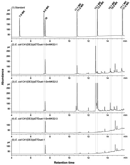 Identification of methylketone products from cell culture of E. coli C41(DE3) expressing three SmMKS2s by gas chromatography–mass spectrometry (GC–MS). 2-Methylketones were identified by GC–MS (see Supplementary File 7), and by comparing their retention times with those of 2-methylketone standards. (1) Authentic methylketone; (2) Cell culture of E. coli C41(DE3) expressing SmMKS2-1; (3) Cell culture of E. coli C41(DE3) expressing SmMKS2-2; (4) Cell culture of E. coli C41(DE3) expressing SmMKS2-3; (5) Cell culture of E. coli C41(DE3) carrying the empty vector (pETDuet-1).