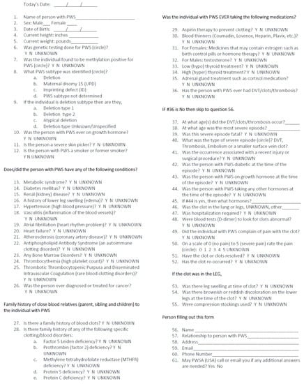 A health-related questionnaire was developed so as to assess the occurrence of vascular issues, blood clots, deep vein thrombosis, and/or pulmonary embolism in PWS, and to characterize the contributing factors based on the frequency of known risk factors from PWS and the general population. The survey material was compiled by a team of researchers and health care providers experienced in PWS in consultation, along with PWSA (USA) leadership. The resulting 66-item health-related questionnaire was posted at the PWSA (USA) website for access by more than 3000 parents or caregivers in the database registry, and was offered as a voluntary survey (see Questionnaire Form, (