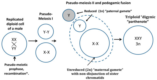 In nature, a “triploid bridge” to asexual reproduction appears as an adaptation to adverse environmental conditions or can be artificially induced by them. In such cases, sexual organisms produce an increased number of unreduced oocytes so that after fertilization triploid sterile individuals appear [29]. Development “with a purpose” of the three-genome organisms seems strange because meiosis ensuring a reproductive process by recombination and ordered reduction “takes only two to tango” [30], while the third is odd. However, triploid individuals have two advantages—(1) the third genome is compatible with mitosis and diminishes the frequency of recessive lethal mutations and so favors clonal survival in a poor environment, (2) a sterile triploid conserves the energy otherwise needed for sex [20,24]. Therefore, the short-term advantage of digyny is even exploited in fish aquaculture when the female fish are treated with hydrostatic pressure, cold- or heat-shock to prevent their oocyte maturation in order to produce artificial triploid food-fish after fertilization [31].