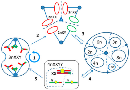 The Digyny Concept of meio-mitosis applied to near-triploid male tumor cells. (1) A digynic triploidy tumor cell line (3nXXY) undergoes mitotic cycles replicating and segregating sister chromatids for growth of the tumor mass. To perform recombinative renewal, it first closes telomere ends, and after replication segregates the genomes of the 3nXXY(x2) cell in (2) tripolar mitosis as 2:2:2 by pairwise fusing the haploid whole genome products of karyokinesis (red circles for arbitrary maternal, green, for paternal genomes) at each pole. (3) A diploid progeny (2nXY) endoreduplicates to 4n XXYY, and to 8n; a triploid subnucleus can also endoreplicate to 6n; 1n Y can be also (rarer) produced in tripolar mitosis (3:2:1); (4) 4n as a subnucleus of the polyploid giant cancer cell (PGCC) or as a free cell enters the recombinative pseudo-meiosis followed by one-step reduction division (for “maternal” sub-nucleus) and two-step reduction (for “paternal” sub-nucleus). A digyny-like fusion in 3n XXY subcell is processed (a dashed box). Alternatively (less likely), one non-recombined 1nY subnucleus from tripolar mitosis of a triploid cell (3:2:1) can fuse with two recombined, unreduced maternal genomes of a pseudo-meiotic diploid sub-cell. (5) A renewed digynic triploid cell restarts mitotic cycling, the process constitutive for tumor near-triploidy and favoring cell survival by compensating lethal recessive mutations. The near-diploid tumors can also enter this hybrid cycle induced through endoreduplication and multipolar mitosis, and thus be converted into triploid digynic stem-line if influenced by senescence, oncogenes, and genotoxic therapy.