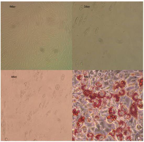 After reaching 90% confluence, the cells were transferred to six-well plates (Corning Costar, New York, NY, USA) at a density of 6 × 106 cells in 2 mL per well, incubated at 37 °C in an atmosphere of 5% CO2 and 95% O2, and cultured until 90% confluence. The standard culture medium was removed and replaced with adipogenic induction medium (DMEM containing 10% FBS, 0.5 mM 3-isobutyl-1-methylxanthine, 1 µM dexamethasone, and 10 µg/mL insulin (all Sigma, Beijing, China)) for two days. The differentiation medium was then replaced with maintenance medium (DMEM containing 10% FBS and 10 µg/mL insulin). Cell samples were collected on days 0, 2, 4, and 8, lysed using TRIzol reagent (Invitrogen, Carlsbad, CA, USA), and then stored in liquid nitrogen until RNA purification. There were three biological replicates per time point (n = 3).