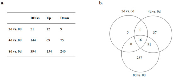As the number of days increased at each time point, more DEGs were detected (Figure 2a). For the day 0 to day 2 comparison, there were only 21 DEGs but, for the day 0 to day 8 comparison, there were 394 DEGs (Table S3). Of those DEGs, only 16 common genes were differentially expressed at all three time-point comparisons (Figure 2b, Table 2).