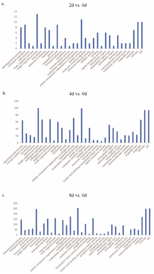 Gene Ontology (GO) functional enrichment analysis of DEGs at different stages. (a) GO terms overrepresented among DEGs between days 2 and 0. (b) GO terms overrepresented among DEGs between days 4 and 0. (c) GO terms overrepresented among DEGs between days 8 and 0. The results are summarized in the following three main categories: biological process, molecular function, and cellular component. The x-axis indicates functional groups. The y-axis indicates number of genes.