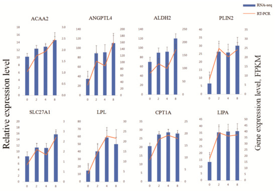 RT-qPCR was conducted to validate ACAA2, ANGPTL4, ALDH2, PLIN2, SLC27A1, LPL, CPT1A, and LIPA expression. The 12 cell samples used in the RNA-seq were used for RT-qPCR validation. The expression patterns of these eight genes were exceptionally consistent with the RNA-seq results (Figure 5).
