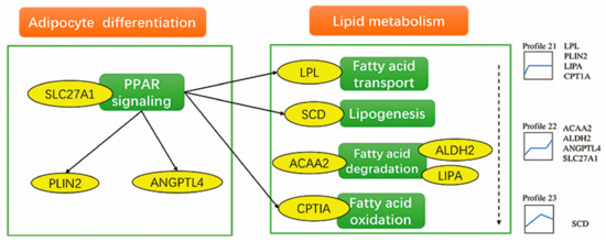 In profiles 21 and 22, there were several significant KEGG pathways related to lipid metabolism. PLIN2, LPL, CPT1A, LIPA, SLC27A1, and ANGPTL4 were found in the PPAR signaling pathway. In the fatty-acid degradation pathway, DEGs CPT1A, LIPA, ALDH2, and ACAA2 were found. JUN was found in the TNF signaling pathway (Table 6).