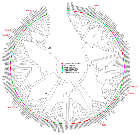 Phylogenetic tree of SAUR proteins from Arabidopsis (red), rice (pink), A. deserti (dark green), A. tequilana (green), A. H11648 (blue) and A. americana (brown). Agave homolog tetrads were highlighted in red. The species-specific expansion of SAUR genes was highlighted in rice (a) and Arabidopsis (b), respectively.