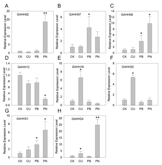 Expression patterns of GAHH02 (A), GAHH07 (B), GAHH08 (C), GAHH12 (D), GAHH16 (E), GAHH20 (F), GAHH21 (G). and GAHH24 (H) under abiotic (Cu and Pb) and biotic (Phytophthora nicotianae Breda) stresses in A. H11648 by qRT-PCR. Y-axis represents relative expression level. CK, CU, PB and PN of x-axis represent control, CuSO4 treatment, Pb(NO3)2 treatment and Phytophthora nicotianae Breda inoculation, respectively. The error bar represents the standard error. * and ** represent that expression level was higher or lower expressed by more than 3-fold and 10-fold, respectively (compared with control).