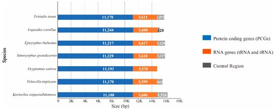 In this study, two complete mitochondrial genomes (mitogenomes) of Syrphidae were sequenced and annotated for the first time (Figure 1). Each newly sequenced mitogenome is circular and double stranded, containing 37 mitochondrial genes (13 PCGs, 22 tRNAs and 2 rRNAs) and one control region (Tables S4 and S5). The sizes of the two mitogenomes were 16,473 bp in K. angustiabdomena (GenBank No. MK870078) and 15,724 bp in V. nigricans (GenBank No. MK870079), respectively. Thus, Syrphidae mitogenomes range from 15,326 bp (E. corollae; NC_036482 []) to 16,473 bp (K. angustiabdomena, MK870078, this study). Within syrphine mitogenomes, length variation is limited in the PCGs and RNAs, but there is remarkable variation in the size of the control region (Figure 2). The patterns of mitogenome genes in the newly sequenced species are the same as those found in all previously sequenced Syrphidae, as well as of the inferred most insect mitogenome order []. A total of 22 genes (9 PCGs and 13 tRNAs) were encoded on the majority strand (J-strand), whereas the remaining 15 genes (4 PCGs, 9 tRNAs, and 2 rRNAs) were located on the minority strand (N strand) (Figure 1, Tables S4 and S5).