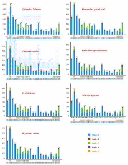 Codon distributions of seven Syrphidae mitochondrial genomes. The stop codon is not given. Numbers on the y-axis refer to the total number of codons. Codon families are shown on the x-axis.