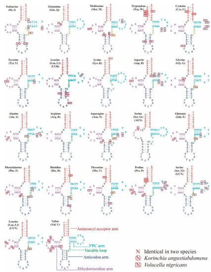 Predicted secondary structures of the 22 tRNAs in Korinchia angustiabdomena and Volucella nigricans. Dashes (–) indicate Watson–Crick base pairing and dots (.) indicate G-U base pairing.