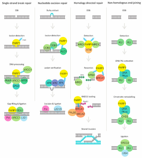 Basic principles and components of major DNA damage response (DDR) pathways in which Poly(ADP-ribose) polymerase 1 (PARP1) has a fundamental role. PARP1 detects the DNA lesion in single strand break repair (SSBR) and in homologous recombination (HR), which is the most common form of homology directed repair [11,20]. PARP1 generally takes part in recruiting repair factors to the lesion site and later interacts with or promotes activity of enzymes during physical repair stage of DDR [12,13,14,15,26].