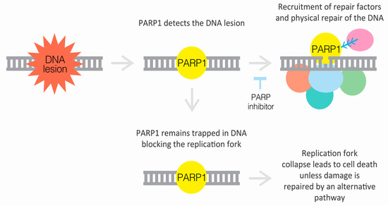 PARP inhibitors (PARPi) reduce the catalytic activity of PARPs. In addition, PARPi trap PARP at the site of DNA damage by preventing PARP from detaching from DNA. Cytotoxic PARP-DNA complexes prevent replication fork from progressing and lead to cell death unless damage is repaired [32,36].