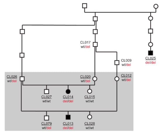 Pedigree of the three investigated cases. Filled symbols represent dogs with recurrent inflammatory pulmonary disease. Open symbols represent non-affected dogs. AKNA:c.2717_2720delACAG genotypes are indicated for all dogs, from which a DNA sample was available. The laboratory identifiers of the 10 dogs that were genotyped on the SNV microarray for linkage and homozygosity mapping are underlined. The grey rectangle indicates the 9 dogs that were used for linkage analysis.
