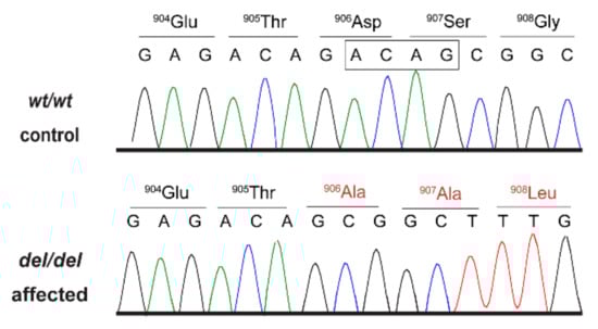 This variant represented a 4 bp deletion that can be designated as Chr11:68,576,241_68,576,244delCTGT (CanFam 3.1 assembly). It was located in the AKNA gene encoding AT-hook transcription factor and is predicted to result in a frameshift of the coding sequence, XM_014117950.2:c.2717_2720delACAG. The variant introduces a premature stop codon. Due to a lack of suitable RNA samples we did not experimentally investigate whether the mutant transcripts are subject to nonsense-mediated decay and/or nonsense-mediated alternative splicing. If expressed, the predicted translation product of the mutant transcript would lack 529 amino acids of the 1434 amino acid wildtype AKNA protein and contain 172 new amino acids at its C-terminus. The formal variant designation is XP_013973425.1:p.(Asp906Alafs*173). We confirmed the presence of the AKNA:c.2717_2720delACAG variant in genomic DNA samples by Sanger sequencing (Figure 2).