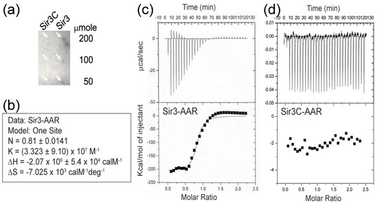 We used the isothermal titration calorimetry (ITC) assay to measure the interaction of AAR with Sir3 under equilibrium conditions. In this assay, AAR (50 μM) was injected into a reaction cell containing Sir3 (5 μM). As shown in Figure 1b,c, the interaction of AAR with Sir3 exhibited an apparent K of ~3.3 × 107 M−1, exothermic properties (ΔH = -2070 kcal/M), and a large negative entropy value (ΔS = -7025 cal/M/deg), suggesting that binding may be accompanied by significant structural rearrangements. We also plotted the integrated heats of binding as a function of the molar ratio of AAR to Sir3. The stoichiometry of AAR binding to Sir3, calculated from the ITC binding data, was 0.81. This may indicate a 1:1 molar ratio of AAR to Sir3. The results of the ITC assays were consistent with those obtained from the dot blotting experiment. Although interaction of AAR with Sir3 was observed (Figure 1c), there was no interaction noted between AAR and Sir3C (Figure 1d).