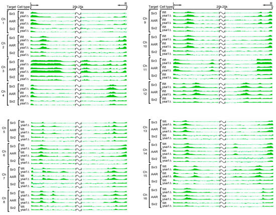 Chromosomal distribution of Sir2, Sir3, and AAR over telomeric regions. The chromosomal distributions of Sir3, Sir2, and AAR were determined through chromatin immunoprecipitation (ChIP)-on-chip and chromatin affinity purification (ChAP)-on-chip assays. For each chromosome, data are presented for a 25 kb region from the left (L) and right (R) of the chromosome ends for Sir3 in wild-type cells, Sir3 in ysa1-deletion cells, AAR in wild-type cells, AAR in ysa1-deletion cells, Sir2 in wild-type cells, and Sir2 in ysa1-deletion cells, as indicated.
