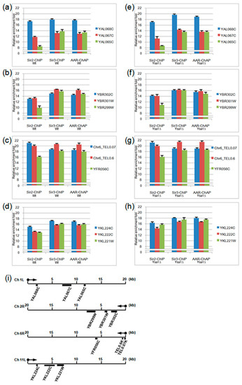 The quantitative polymerase chain reaction (qPCR) results of Sir2-ChIP, Sir3-ChIP, and AAR-ChAP. (a–h). The relative fold-change enrichment of the Sir2, Sir3, and AAR occupancy signals were compared with the respective input DNA. Three test genes/locations on the left arm of the chromosome 1 telomere (a,e), right arm of chromosome 2 telomere (b,f), right arm of chromosome 6 telomere (c,g), or left arm of chromosome 11 telomere (d,h) for wild type (a–d) or ysa1-deletion (e–h) cells are indicated, respectively. (i) Illustration indicating the individual relative location of each gene on different telomeric regions. Cell type: Wt: wild-type strain; ysa1Δ: ysa1-deletion strain.