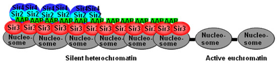 Epigenetic inheritance of chromatin is a non-DNA sequence-dependent phenomenon. Chromatin is packaged from DNA together with other associated proteins and molecules. It is organized in euchromatin and heterochromatin states [1,2,3]. Transcriptionally active portions of DNA are termed euchromatin, whereas transcriptionally less-active condensed chromosome regions are termed heterochromatin. The established silent heterochromatin regions of the budding yeast, Saccharomyces cerevisiae, a eukaryotic microorganism, are silent mating type loci (HML and HMR), telomeric regions and ribosomal DNA (rDNA) tandem repeats [2,4,5,6].