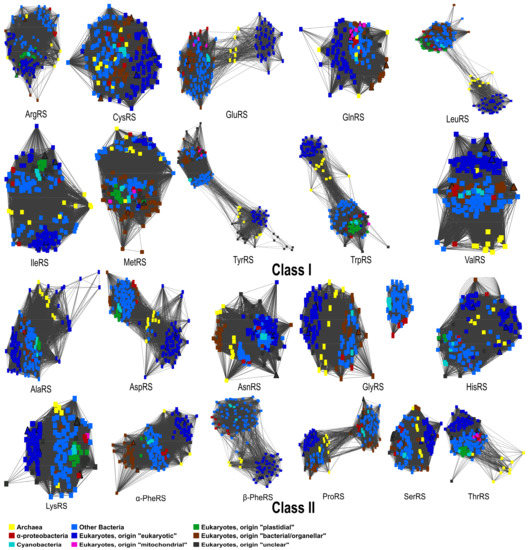 We performed phylogenetic analyses of all 20 AaRSs from chromerid algae. Similarity networks for the whole set of Aminoacyl-tRNA synthetases reflect the tree topology of each Aminoacyl-tRNA synthetase [77] (Figure 2). Out of the 21 computed trees (PheRS has two subunits), only the β-PheRS tree fully corresponds to the classical three-domain pattern that is postulated for eukaryotic enzymes. The archaeal and eukaryotic AaRSs were well separated from the bacterial group, in agreement with previous studies [48]. The remaining trees show two or more divergent bacterial clades (Figure 2). Furthermore, in both chromerids, endosymbiotic gene transfer events were only observed in ArgRS and TrpRS. Interestingly, for LeuRS and TyrRS there are two unrelated groups, likely the result of independent evolution of the eukaryotic and prokaryotic versions of these two enzymes (Figure 2). The remarkable dissimilarities of various regions in bacterial and eukaryotic LeuRS and TyrRS have also been observed in previous studies [48,78].