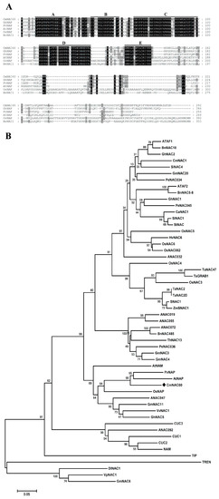 Multiple sequence alignment and phylogenetic analysis of CmNAC60 with other reported NAC protein sequences from different plant species that were functionally characterized. (A) Multiple sequences alignment of CmNAC60 with NAC protein sequences regulating leaf senescence from different plant species were aligned using the ClustalW2 software, and displayed with the GeneDoc software. Identical amino acids are shaded in black, and similar amino acids are shaded in gray. The locations of the five highly conserved amino acid motifs (A–E) are marked with overlines. (B) The phylogenetic tree was constructed from CmNAC60 with other different NAC proteins using MEGA5.0 with 1000 bootstrap replicates. Bootstrap support values are indicated on each node. CmNAC60 is labeled with a black rhombus.