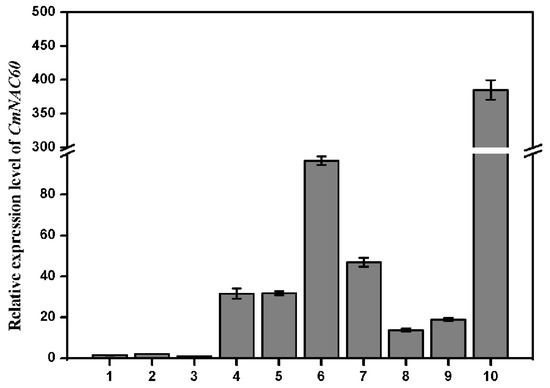 Relative expression levels of CmNAC60 in different organs of oriental melon. The numbers represent the following: (1) seeds, (2) cotyledon (3) hypocotyls (4) young leaves, (5) stem (6) root (7) tendril (8) 15 d fruit after pollination, (9) female flower, and (10) male flower. The expression levels are calculated relative to the CmNAC60 expression in the hypocotyls, which was set as 1. The 2−ΔΔCT method was used in the qRT-PCR analysis. Data are mean ± standard deviation (SD) from three biological replicates. Bars indicate standard deviation.