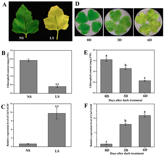 Chlorophyll contents and relative expression levels of CmNAC60 in oriental melon leaves during natural senescence and dark treatment. (A) Oriental melon leaves at non-senescing and naturally senescing stages. NS—a fully expanded and non-senescent leaf; LS—a late senescence leaf. Chlorophyll contents (B) and relative expression levels of CmNAC60 (C) at two stages of natural senescence. (D) The detached leaves of oriental melon treated in the dark for zero, three, and six days. Chlorophyll contents (E) and relative expression levels of CmNAC60 (F) at different dark treatment times. Data are mean ± SD from three biological replicates. The experiments were independently repeated three times with 12 leaves each time. Asterisks indicate statistically significant differences compared with NS (** p < 0.01). Different lowercase letters indicate statistically significant differences at p < 0.05. Bars indicate standard deviation.