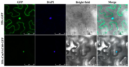 The subcellular localization of CmNAC60 was determined to find out whether CmNAC60 function as a transcription factor. The full-length coding sequence of CmNAC60 without a stop codon was fused to the GFP gene sequence in the PYG57 vector. The CmNAC60-GFP fusion construct and the GFP control in the PYG57 vector were transiently expressed in the leaves of N. benthamiana, respectively, followed by observing the subcellular localization of CmNAC60 using a laser scanning confocal microscope. The results showed that GFP was located to the periphery of the cell, likely in the cytoplasm of the epidermal cells shown in the figure, while the fluorescence signal of the CmNAC60-GFP fusion protein was observed in the cell nucleus, which was confirmed by staining with DAPI (Figure 4).