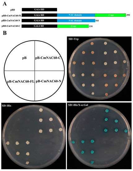The full-length, the N-terminal, and C-terminal domain coding sequence of CmNAC60 were separately inserted into the pBridge vector, which contains a GAL4 DNA-binding domain, to determine which part of the CmNAC60 protein has the transcriptional activity. These constructs and the empty vector (negative control) were transformed into yeast strain AH109 cells separately. All of the transformed yeast cells grew well on a SD/-Trp medium, which indicated that the constructs had been successfully transformed into AH109 cells (Figure 5B).