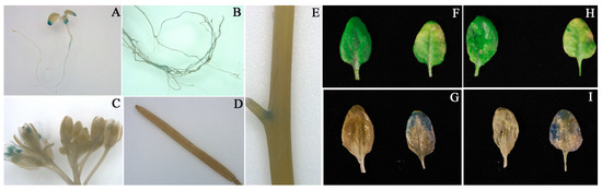Tissue specific expression of CmNAC60 in transgenic Arabidopsis. (A) Seven-day-old seedlings. (B) Root, (C) inflorescence, (D) immature silique, and (E) stem of a six-week-old plant. (F,H) Non-senescing and senescing rosette leaves of a six-week-old plant before GUS staining. (G,I) Rosette leaves after GUS staining corresponding to (F,H).