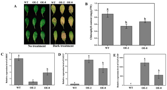 The phylogenetic tree analysis suggested that CmNAC60 might be related to leaf senescence, so the relative expression levels of CmNAC60 induced by natural senescence and dark treatment were examined. The relative expression level of CmNAC60 in the naturally senescing leaves of oriental melon was higher than in the non-senescing leaves (Figure 3C). After dark treatment for three and six days, the relative expression levels of CmNAC60 in the leaves of oriental melon increased significantly compared with the untreated leaves (Figure 3F). Furthermore, the chlorophyll contents of the melon leaves during natural senescence and dark treatment decreased significantly (Figure 3B,E).