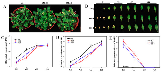 Natural senescence phenotypes of CmNAC60 overexpressing lines. (A,B) Phenotypes of CmNAC60 overexpressing lines OE-2, OE-8, and wild type (WT) under a normal environment after five weeks of growth. (G1–G4) The detached leaves were divided into four groups according to the senescence status. (C–E) Chlorophyll contents (C), the relative expression levels of RBSC (D), and SAG12 (E) in the four groups of detached leaves corresponding to (B). The experiments were independently repeated three times, and 12 plants were used each time. Data are mean ± SD from three biological replicates. Bars indicate standard deviation.