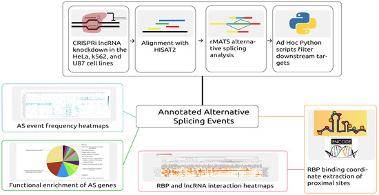 To dissect the functional impact of lncRNAs on splicing, we downloaded publicly available RNA-Seq data from a study (GSE85011) [4] where multiple lncRNAs were knocked down across three human cancer cell lines (Table 1). As illustrated in the workflow (Figure 1), the RNA-Seq data were aligned to the human reference genome. The aligned data were further analyzed to identify alternative splicing events across lncRNA knockdowns and corresponding control samples. RBP binding profiles were analyzed to understand their binding preference around alternative splice events. The following sections discuss individual steps involved in our workflow in detail.