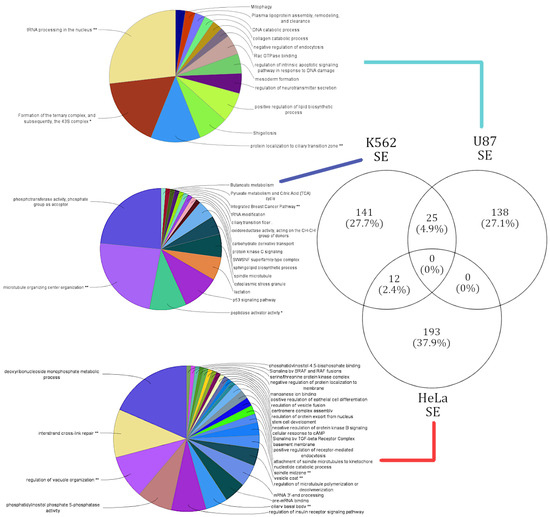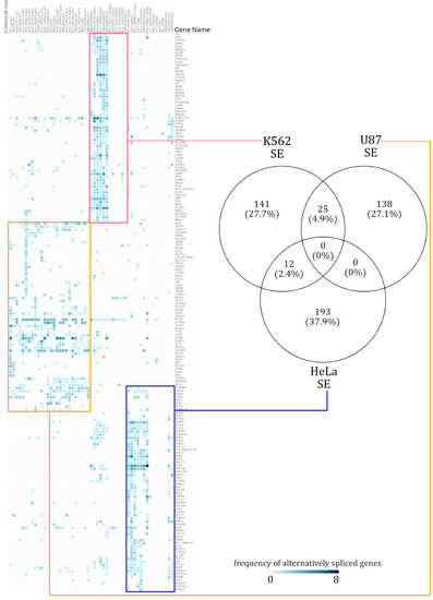 3.4.1. Genes Alternatively Spliced via SE Events in U87, HeLa, and K562 Reveal Cell-Type-Specific Functional Enrichment