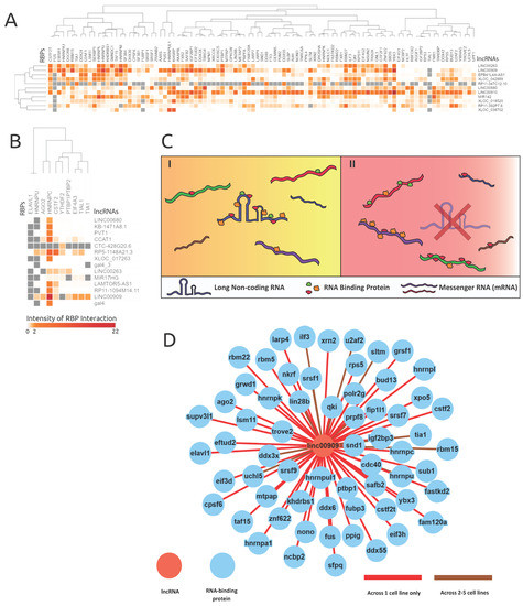 The lncRNA–RBP binding-profile-based clustering analysis across both cell lines was not very informative. However, an interesting behavior was revealed where certain lncRNAs (e.g., LINC00909, LINC00263, and LINC00910) had many binding events across many RBPs. Therefore, the downstream alternative splicing caused by the loss of a lncRNA is induced by the absence of an RBP binding sponge. As highlighted in the model shown in Figure 4C, in cancer cells a lncRNA might bind to many RBPs, where its expression level could facilitate extensive RBP interactions. However, in the event of a lncRNA knockdown or due to the loss of function of a lncRNA, an abundance of RBPs interact with pre-mRNA targets illustrated in Figure 4C, thereby inducing alternative splicing.