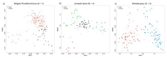 Multidimensional scaling (MDS) plot with the number of clusters assigned in (a) Belgian Warmblood horses (K = 3), (b) Icelandic horses (K = 4), and (c) the Shetland ponies (K = 2). Additionally, to investigate whether the higher density SNP-array in Belgian Warmblood horses rendered more significant results, a subset of SNPs was obtained representing the overlap between the 65 k Illumina equine HD chip and the 670 k Affymetrix Axiom Equine Genotyping Array. As a case study, a GWA analysis was performed in the Belgian Warmblood horse population using all SNPs (474,128 after quality control) and using the subset of SNPs for L_Culn7 (as most significant results were obtained using the IgE levels against this C. nubeculosus allergen).