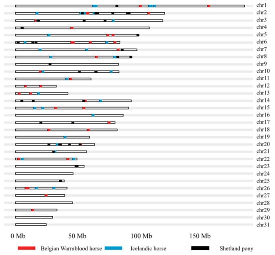 For the Icelandic and Shetland samples, DNA was extracted, as described by Schurink and colleagues [], and the samples were genotyped while using the Illumina equine HD chip containing 65,157 single-nucleotide polymorphisms (SNPs). For the Belgian Warmblood samples, DNA was extracted from blood samples (200 µL) while using the Qiagen kit. Belgian Warmblood samples were genotyped using the Affymetrix Axiom Equine Genotyping Array containing 670,796 SNPs. Quality control was separately assessed in each population using GenABEL in R []. SNPs with a minor allele frequency (MAF) <1% and call-rate <95% were discarded and a threshold for minimum call rate per horse was set to 90%. In the Icelandic horse population, 127 horses and 52,655 SNPs (80.8% of the SNPs) remained after quality control, while 199 ponies and 49,567 SNPs (76.1% of the SNPs) remained in the Shetland pony population. In the Belgian Warmblood horse population, 214 horses and 474,128 SNPs (70.7% of the SNPs) retained after quality control.