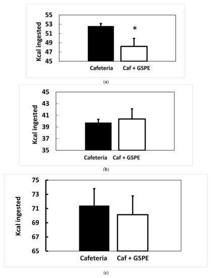 Food intake in the short-cafeteria study in different diet periods. Food intake was measured 20 h after the daily food had been replaced for each diet administered. The black column indicates animals not treated with grape seed proanthocyanidin extract (GSPE). The white column indicates animals treated with 0.5 g/Kg BW of GSPE for the first 10 days of treatment. The results showed the mean data obtained from each measurement throughout the period. (a) Mean food intake from the daily measurement for the first ten days of treatment with a tasty diet. (b) Mean food intake from measurements taken during the eighteen days of treatment with a chow diet. (c) Mean food intake from measurements during the thirty-five days with a cafeteria diet. Statistical differences identified by t-test are defined by * when p < 0.05 between treatments.