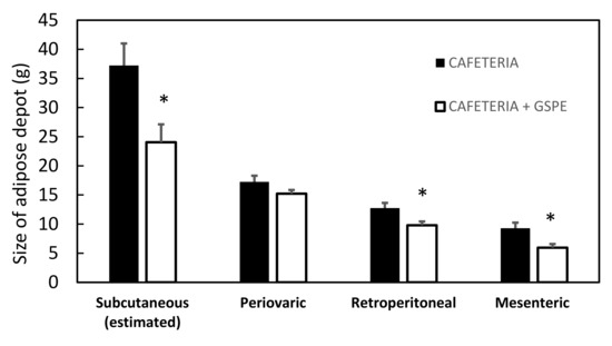 GSPE effects on white adipose depots in the short cafeteria study. Adipose depots were obtained at the end of the treatment and each depot was weighed. Rats were treated with 0.5 g/Kg BW for the first 10 days, and then they were put on a chow diet for 18 days and a cafeteria diet for 35 days. The black column indicates animals not treated with GSPE. The white column indicates animals treated with 0.5 g/Kg BW of GSPE for the first 10 days of treatment. The data are the mean ± standard error of the mean (S.E.M.) (n = 7). Statistical differences identified by t-test are defined by * when p < 0.05 between treatments.