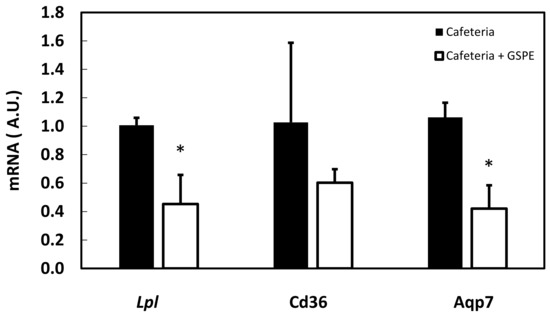 As mesenteric depot was the highest reduced by GSPE treatment, to identify the effects of GSPE on triglyceride entry into adipose tissue, we measured the gene expression of the genes related to this process. We assayed Lpl (lipoprotein lipase), the enzyme that hydrolyses triglycerides into fatty acids and glycerol, before their uptake into the cell; Cd36 (CD36 molecule), involved in free fatty acid uptake into the cell; and Aqp7 (aquaporin 7), which facilitates the efflux of glycerol from the cell. Figure 3 shows that the amount of Lpl in the mesenteric depot was highly reduced, as was the amount of Aqp7. There were no statistically significant differences for the fatty acid transporter (Cd36).