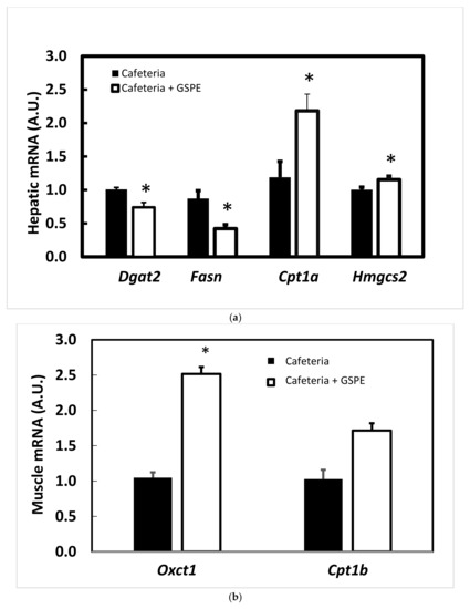 In our search for an explanation for the lower RQ observed in GSPE pre-treated rats [17], we analysed liver and muscle gene expressions. Figure 4a shows a significant increase in Cpt1a (carnitine palmitoyltransferase 1a) and Hmgcs2 (3-hydroxy-3-methylglutaryl-CoA synthase 2), suggesting the increased oxidation of fatty acids and the active synthesis of ketone bodies in the liver of GSPE-pre-treated animals. In addition, decreased Fasn and Dgat 2 (diacylglycerol O-acyltransferase 2) expression suggested decreased synthesis and esterification of fatty acids.