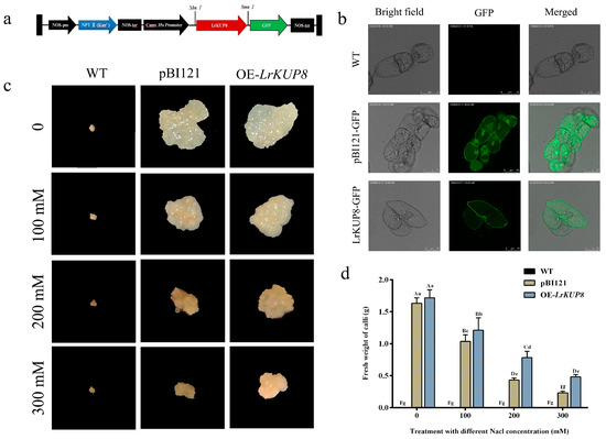 Expression analysis indicated that LrKUP8 is strongly induced by salt, and its protein is targeted to the PM. Thus, LrKUP8 might be involved in ion acquisition under salt treatment. Calli were transformed with the pBI121–LrKUP–GFP recombinant vector to study whether LrKUP8 regulates salt tolerance, and the pBI121–GFP vector was used as the control (Figure 4a). After screening from a medium with kanamycin, NPTII, LrKUP8-GFP, and GFP were examined by PCR amplifications to guarantee the genome presence of LrKUP8 (Figure S1, Supplementary Materials). Before the transgenic lines were re-cultured for salt treatment, GFP imaging was also performed to ensure the expression of LrKUP8–GFP protein. As expected, the GFP signal was absent in wide type calli but was observed mainly in cytoplasm and nucleus in the empty vector control (Figure 4). Comparatively, LrKUP8-GFP fluorescence was predominantly localized at the membrane system (Figure 4b), indicating that LrKUP8 expressed normally in transgenic calli. The kanamycin was always used to ensure that all or most of the transgenic callus cells were positive cell clones. In the absence of salinity stress conditions, the vector control and LrKUP8 overexpressing calli exhibited similar growth rates. The differences appeared at 100 mM NaCl and became highly pronounced at 200 mM NaCl. The 300 mM NaCl treatment considerably delayed the growth of all studied calli (Figure 4c). However, the growth of OE-LrKUP8 calli under the 300 mM NaCl treatment was better than that of the control calli because the vector control calli almost stopped growing, whereas the transgenic calli continually grew. The wild-type callus cells could not grow because they were not resistant to the aminoglycoside antibiotic kanamycin. The fresh weight analysis also indicated that when the NaCl concentration was 200 mM or higher, the OE-LrKUP8 calli grew considerably faster than the vector control calli (Figure 4d). Therefore, our results indicate that the overexpression of LrKUP8 improves callus salt tolerance, especially at a high NaCl level.