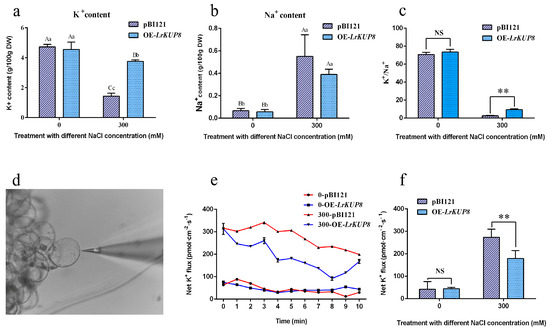 LrKUP8 reduces K+ efflux in calli. (a) K+ content of L. ruthenicum calli with 300 mM NaCl for 50 days expressing GFP or LrKUP8-GFP. The data is from three samples (n = 3). (b) Na+ content of L. ruthenicum calli with 300 mM NaCl for 50 days expressing GFP or LrKUP8-GFP. The data is from three samples (n = 3). (c) K+/Na+ ratios of L. ruthenicum calli with 300 mM NaCl for 50 days expressing GFP or LrKUP8-GFP. The data is from three samples (n = 3). (d) The measuring position using K+-selective microelectrode of NMT. (e) K+ flux rates measured by NMT/MIFE assays of L. ruthenicum calli expressing GFP or LrKUP8-GFP under control or 300 mM NaCl treatment after 12 h. The data is from six samples (n = 6). (f) Histogram analyses of K+ in L. ruthenicum calli expressing GFP or LrKUP8-GFP under control or 300 mM NaCl treatment after 12 h. The data is from six samples (n = 6). The mean ± SE of all replicates is presented. The upper- and lowercase letters on the histogram indicate p < 0.01 and p < 0.05, respectively. The double asterisks represent p < 0.01. NS means not significant.4. Discussion.