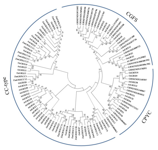 We systematically surveyed the maize genome to identify putative maize GRX genes. To further assess the phylogenetic relationship between GRX, we constructed a phylogenetic tree of maize, rice, and Arabidopsis thaliana GRXs (Figure 1, Table S1). As shown in Figure 1, a total of 106 GRX genes were divided into three types: CC, CP, and CG (Figure 1). We found that the CC-type subgroup had the most members among all the subgroups in maize. All Arabidopsis and rice GRX genes fell in the same class or clade as previously reported, in agreement with previous work [11,12]. Interestingly, the Arabidopsis GRXs were isolated from the two monocotyledons and clustered into a single branch in Figure 1.