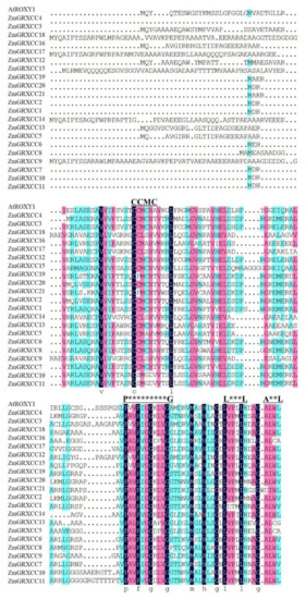 Using the protein sequence of GRXs from rice and Arabidopsis, we found 21 ZmGRXCCs that contain a conserved redox activity site in the maize B73 genome (genomic version: AGPV3.0). To analyze the conserved motifs of identified ZmGRXCCs, we performed multiple sequence alignments of ZmGRXCCs and AtROXY1 (Figure 3). It was found that 11 of the 21 ZmGRXCCs shared an ALWL motif at the C terminus and was further extended to A(D)L(I)W(C)L(A/G/V) (Figure 3, Table 1). ZmGRXCCs also shared a distinctive CC(S/P)M(C/S) redox site (Figure 3, Table 1). The fact that the redox motif of ZmGRXCCs shares high sequence similarity with AtROXY1 demonstrates that CC-type GRXs undergo a relatively conserved evolutionary history (Figure 3, Table 1).
