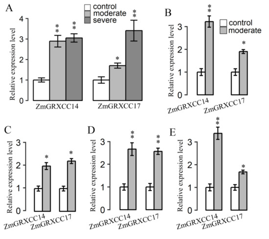 Expression patterns of ZmGRXCC14 and 17 in seedlings (A), V12 (B), V14 (C), V16 (D), and R1 (E) under drought. ZmUbi-2 was used as an internal control for data analysis. The mean and SD were calculated from data of three biological replicates. t-test, * p ≤ 0.05, ** p ≤ 0.01.