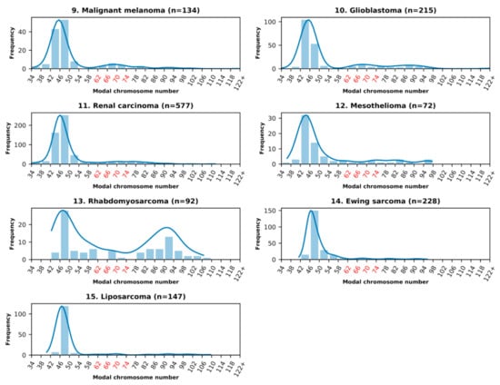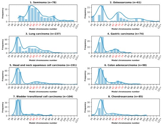 3.1. Analysis of the Histograms of the Modal Chromosome Numbers in 15 Cohorts of Malignant Tumors