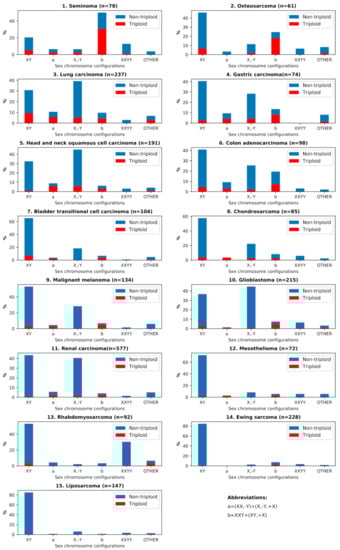 Vainshelbaum, N.M.; Zayakin, P.; Kleina, R.; Giuliani, A.; Erenpreisa, J. Meta-Analysis of Cancer Triploidy: Rearrangements of Genome Complements in Male Human Tumors Are Characterized by XXY Karyotypes. Genes 2019, 10, 613. https://doi.org/10.3390/genes10080613