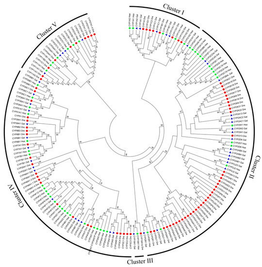 Figure 1. Phylogenetic tree of Cytochrome P450 (CYP) from human, chicken, and zebrafish genomes. The phylogenetic tree shows 57 CYPs from Homo sapiens (Has, highlighted in green rhombus), 45 CYPs from Gallus gallus (Gal, highlighted in blue triangles), and 83 CYPs from Danio rerio (Dre, highlighted in red circles). The phylogenetic tree was built in MEGA5 using the neighbor-joining method with 1000 bootstrap replicates.
